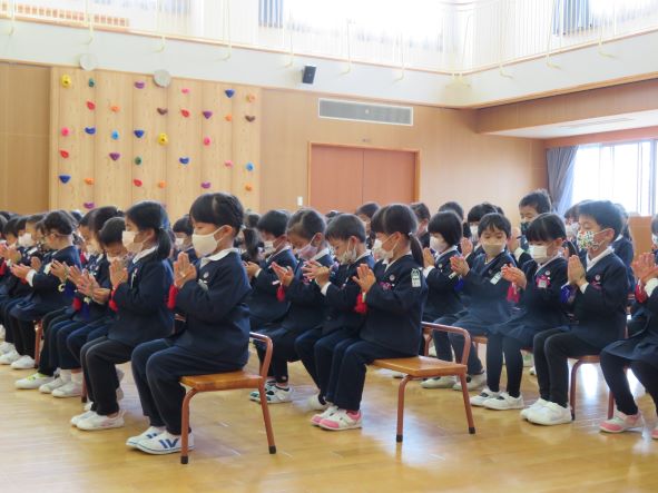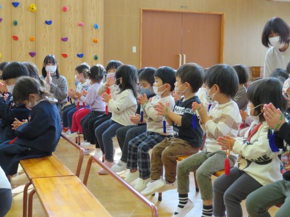 園では年中・年長と年少・2歳児に分かれて遊戯室で集会を行いました。