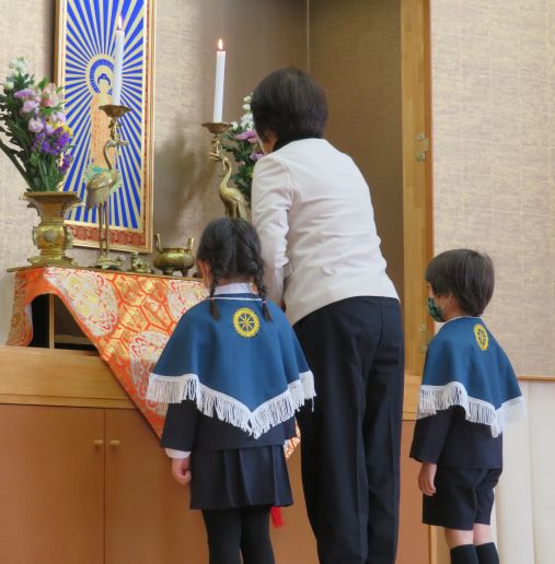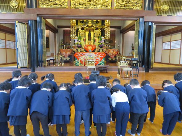 集会後に本堂に行ってお参りをさせて頂きました。きれいに飾られた荘厳な雰囲気を感じ手を合わせる子どもたちでした。