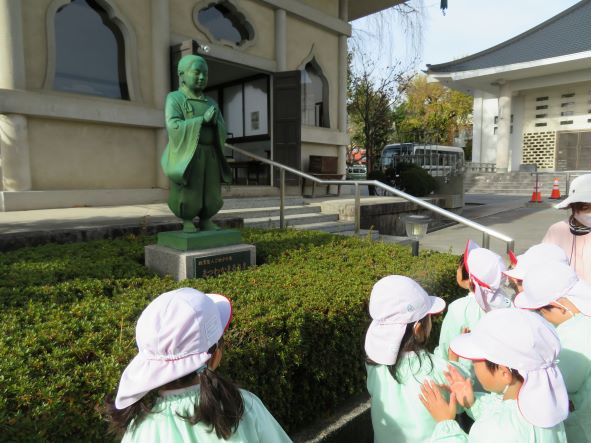 園庭の納骨堂前には親鸞様の幼少期の銅像、松若丸様があります。松若丸様と同じように手を合わせる子どもたちでした。