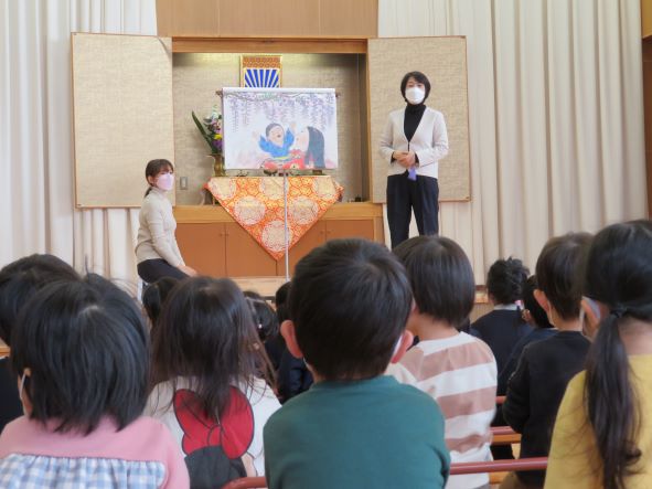 お念珠を手にかけてお参りをします。園長先生から掛図を使ってお話をして頂きました。2歳児のお友だちも落ち着いてお話を聞くことができました。