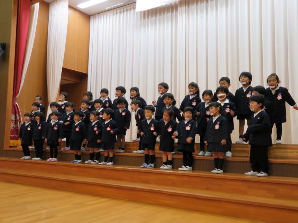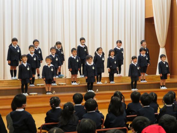 年少さんは学年のお友だちとステージに立ちました。先生とかけ合いながら、歌に合わせて手遊びをするかわいらしい姿が見られました。
