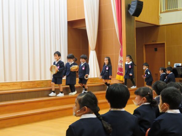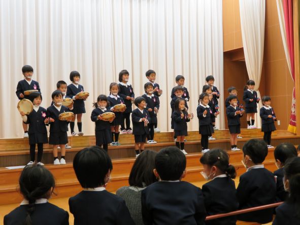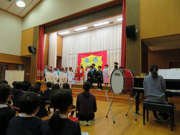 年中さんはクラスのお友だちと立つステージは初めてでしたが、お友だちと一緒に歌ったり合奏したりする楽しさや,音や声の揃う気持ちよさを感じ始めています。