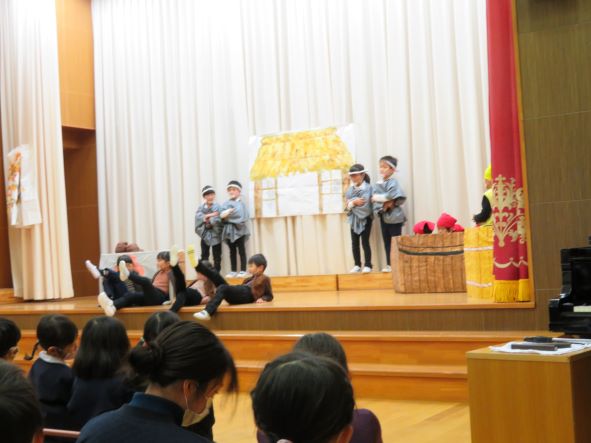 年長さんもステージで劇を見てもらうのは初めての経験です。クラスのお友だちと劇を作っていきながら表現する楽しさも味わい始めています。