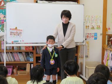 年長さんの誕生者は3名でした。園長先生がクラスを回ってペンダントをかけてお祝いして下さいます。