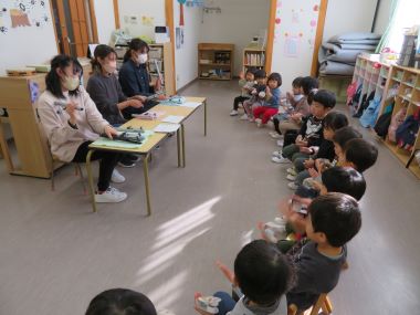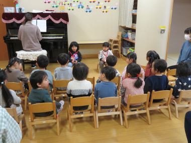 アトラクションでは、先生たちがきれいな優しい音色のトーンチャイムを聞かせてくれました。先生に合わせてお友だちも手作りのカスタネットを一緒に打ちました。