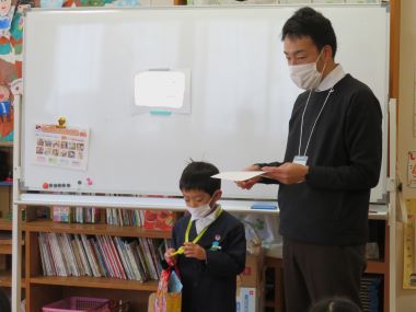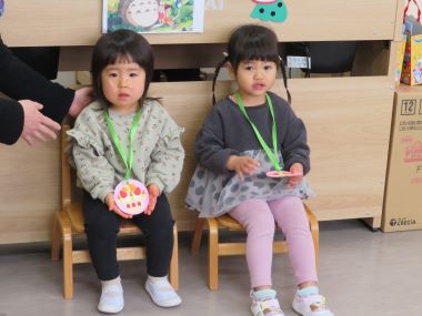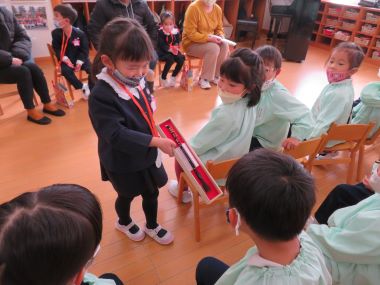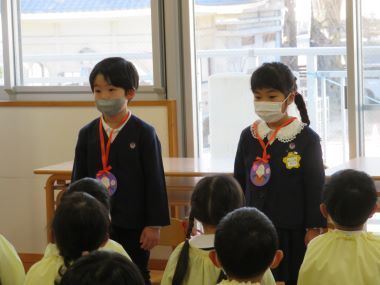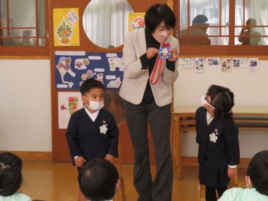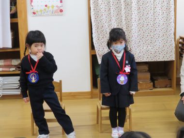 年少さんの1月生まれのお友だちは2名。12月の誕生会にお休みしたお友だち1名も一緒にお祝いしました。