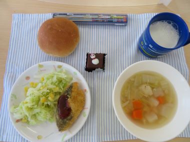 今日の給食です。ケーキには雪だるまがあしらわれていました。(0.1歳児のデザートは果物)