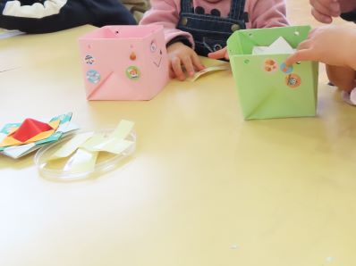 糊もテープも使わずに作る箱を作ってもらい、お友だちが好きなシールを貼って、水引の持ち手を付けてもらうと、素敵なバッグができあがりました。できあがったバッグが気に入ったようで、早速コマを仕舞っていたさくらんぼさんたちでした。