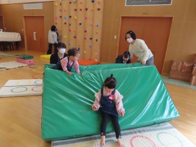活動の前には、おままごと道具で遊んだり、はしご付きのすべり台や大きなお山で遊びました。体が器用に動くようになりましたね。