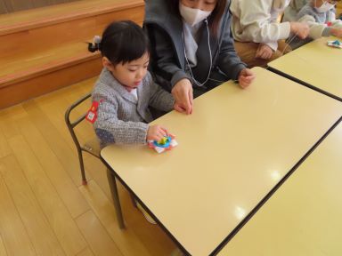 何に入っているのか・・・恐る恐る開けてみると・・・中から”折り紙ゴマ”が出てきました!早速自分で回して楽しんでいましたよ!