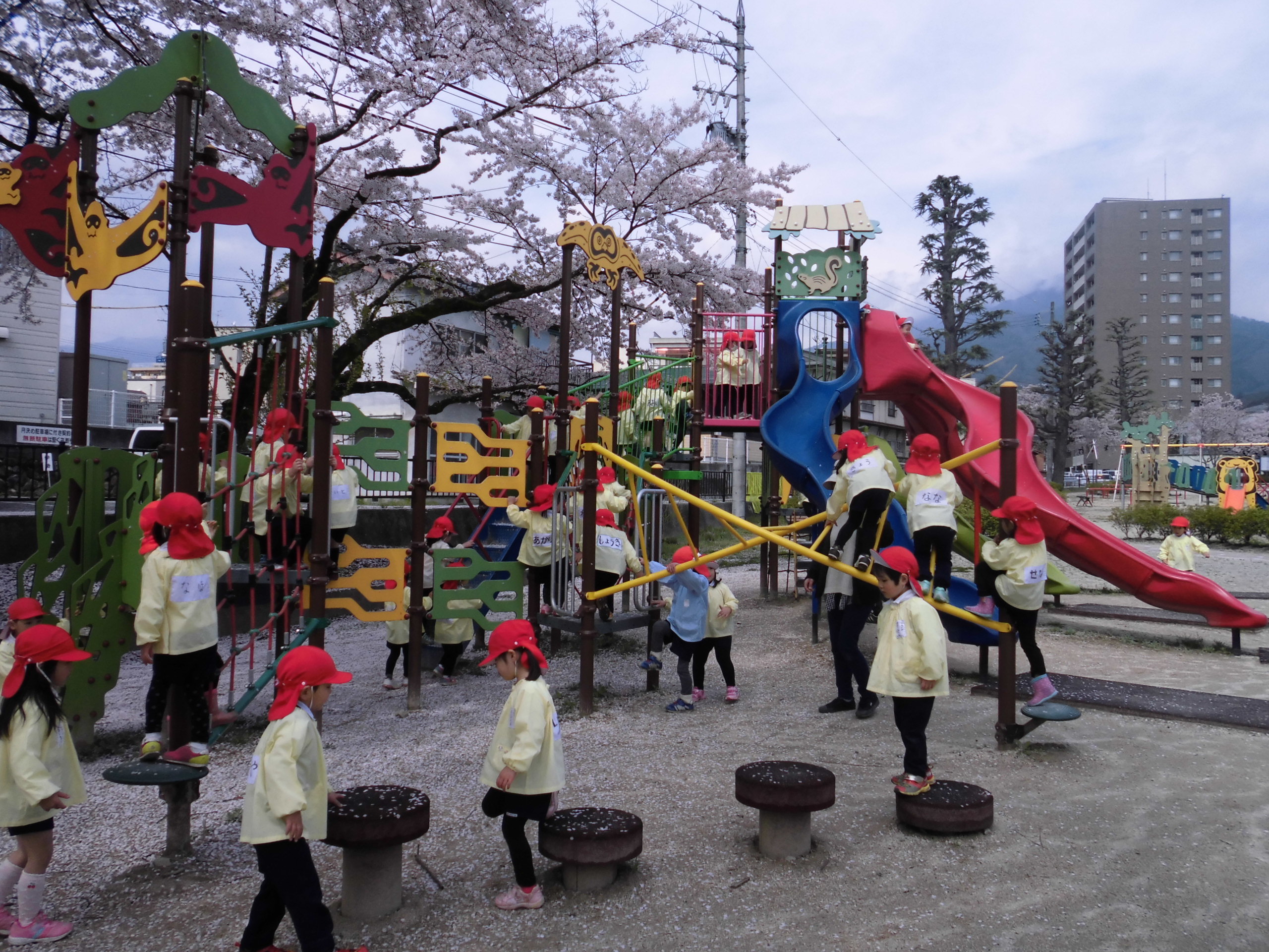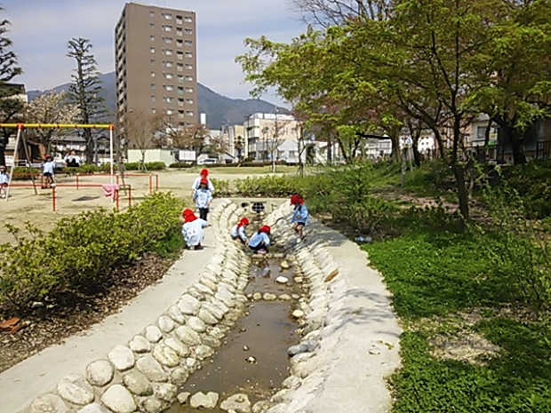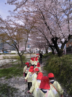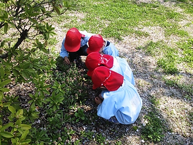 年長さんは遊具より公園の環境そのものが遊びになり、水路を飛び越えてみたり、広場で鬼ごっこが始まったり、小さな草花にも関心を寄せたり・・・生き生きと春を楽しみながら遊んでいました。