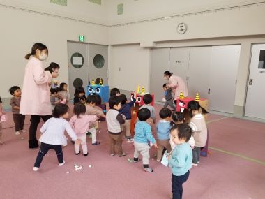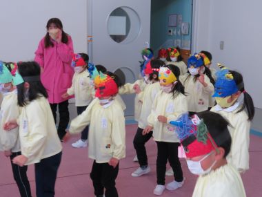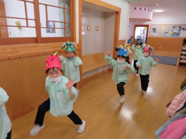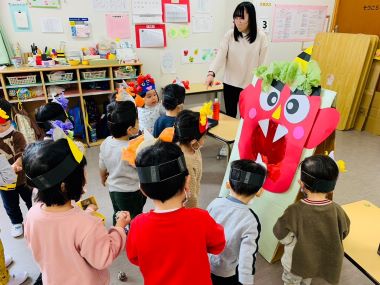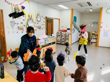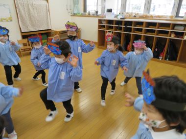年少さんの部屋では、鬼のお面を付けたかわいらしい鬼たちが表現遊びをしていました。