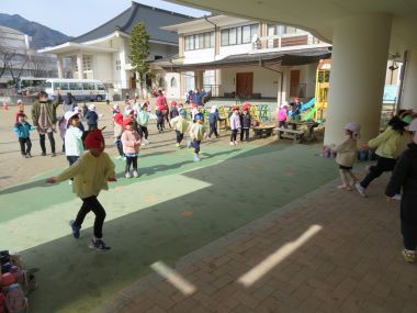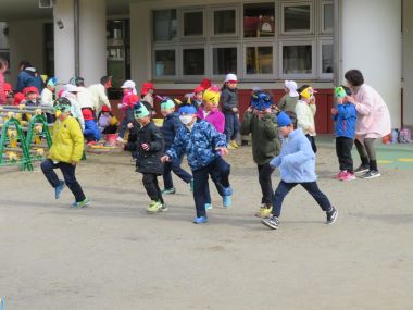 午後、外で遊んでいると、、、年長の鬼が勢いよくやってきました。 年少・年中さんはビックリ!