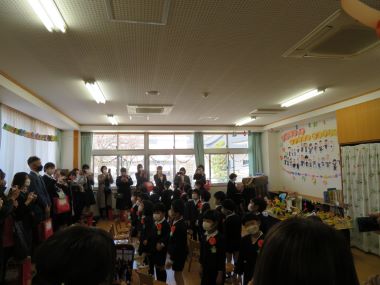 保育室では担任より最後の挨拶をさせて頂いたり、皆で歌をうたってお別れです。名残惜しい子どもたち。
