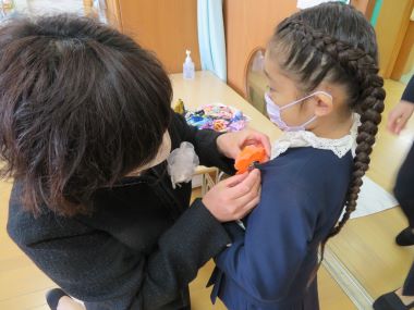 先生にコサージュをつけてもらっています。このコサージュは15日の卒業をお祝いする会で年中さんからプレゼントされたものです。