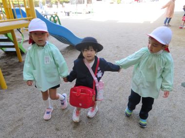年長さんは朝、園庭で職員と一緒に年少さんを出迎えてくれ、優しく手をつないで玄関まで連れて行ってくれます。小さいお友だちに関わることで、相手の気持ちを考えて声をかけたり、「年長さんになった」と実感したりしているようです。