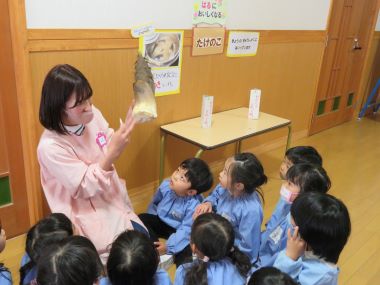 「チクチクする」「ザラザラしてる」「これが竹のあかちゃん?」など触ったり話を聞いて様々に感じた子どもたちでした。