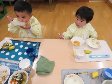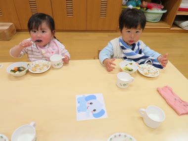 「おいしい!おかわり」の声も沢山聞こえたようです。たんぽぽさんも自分でスプーンを使ってパクパク食べていました。