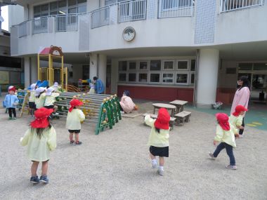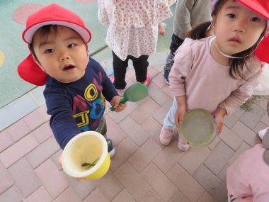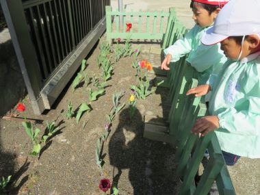年長さんは花壇に咲いたチューリップを見つけました。このチューリップは、卒業した年長さんから託された球根を年中の時に植えたものです。きれいに咲き始めて一安心。2歳のお友だちはダンゴムシを見つけました。虫の動きに夢中な子どもたち。