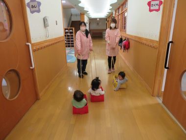 つくしさんは車に乗って先生とお散歩。先生と顔を見合わせて手を振ったり、お兄さんお姉さんのクラスを見ながらお散歩です。