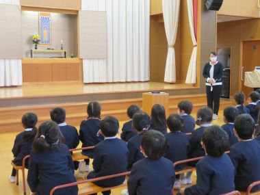 年長さんは「園長講話」がありました。年長さんだけが集まって園長先生からお話をお聞きします。今回は皆の事をいつも見守ってくださるののさまのお話や、「南無阿弥陀仏」の言葉の意味や大切さなどを写真や本を用いながらお話して下さいました。年長さんは年に数回このような園長講話を行い、園長先生からお話をお聞きする予定です。