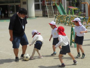 食後は保護者の方に保育参加をして頂きました。サッカーをする年長さん。