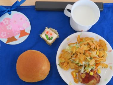 パンを割ってハンバーグやサラダを挟んでハンバーガーにしても食べられます。ハンバーグは給食の先生方が「おいしくなーれ」の気持ちを込めて1つ1つ丸めてくれました。ケーキには桜があしらわれたチョコを花の形にくりぬいたケーキでした。
