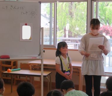 年長の誕生者は3名。園長先生にクラスを回って頂き、ペンダントをかけてお祝いしていただきました。お家の方からは、お子さんの名前の由来についてお話し頂きます。