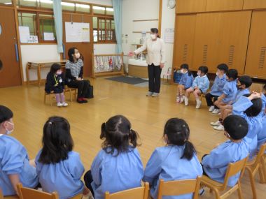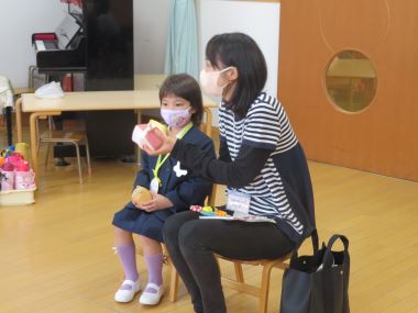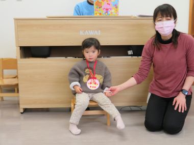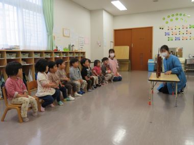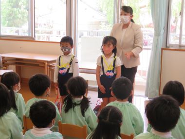 髙松先生からペンダントをかけて頂いて、皆に歌をうたってもらいました。アトラクションは、紙芝居。クラスのお友だちと楽しい時間を過ごしました。