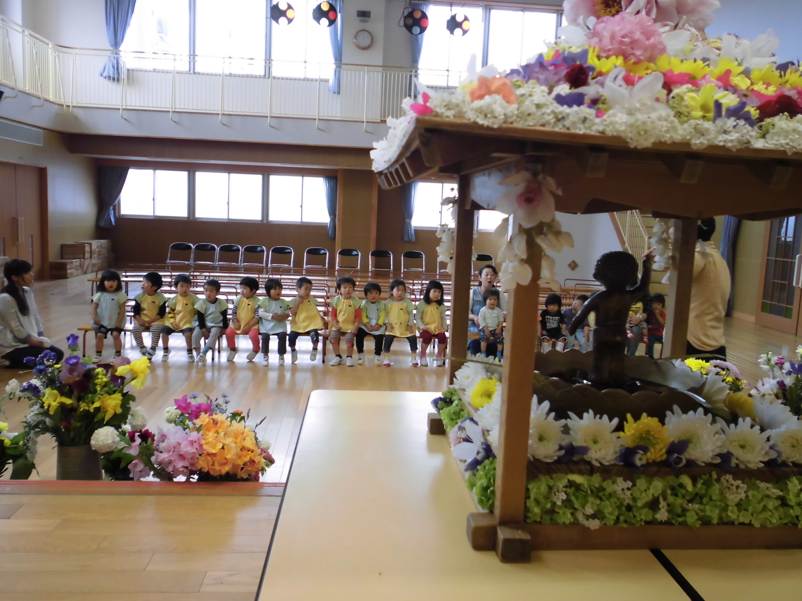 初めに3歳未満の子どもたちが集会をしました。花御堂の中の小さなお釈迦様を見ながら、先生から花まつりのお話を聞き、お友達と一緒に灌仏をしました。小さな手で柄杓を持ち、甘茶をかけています。