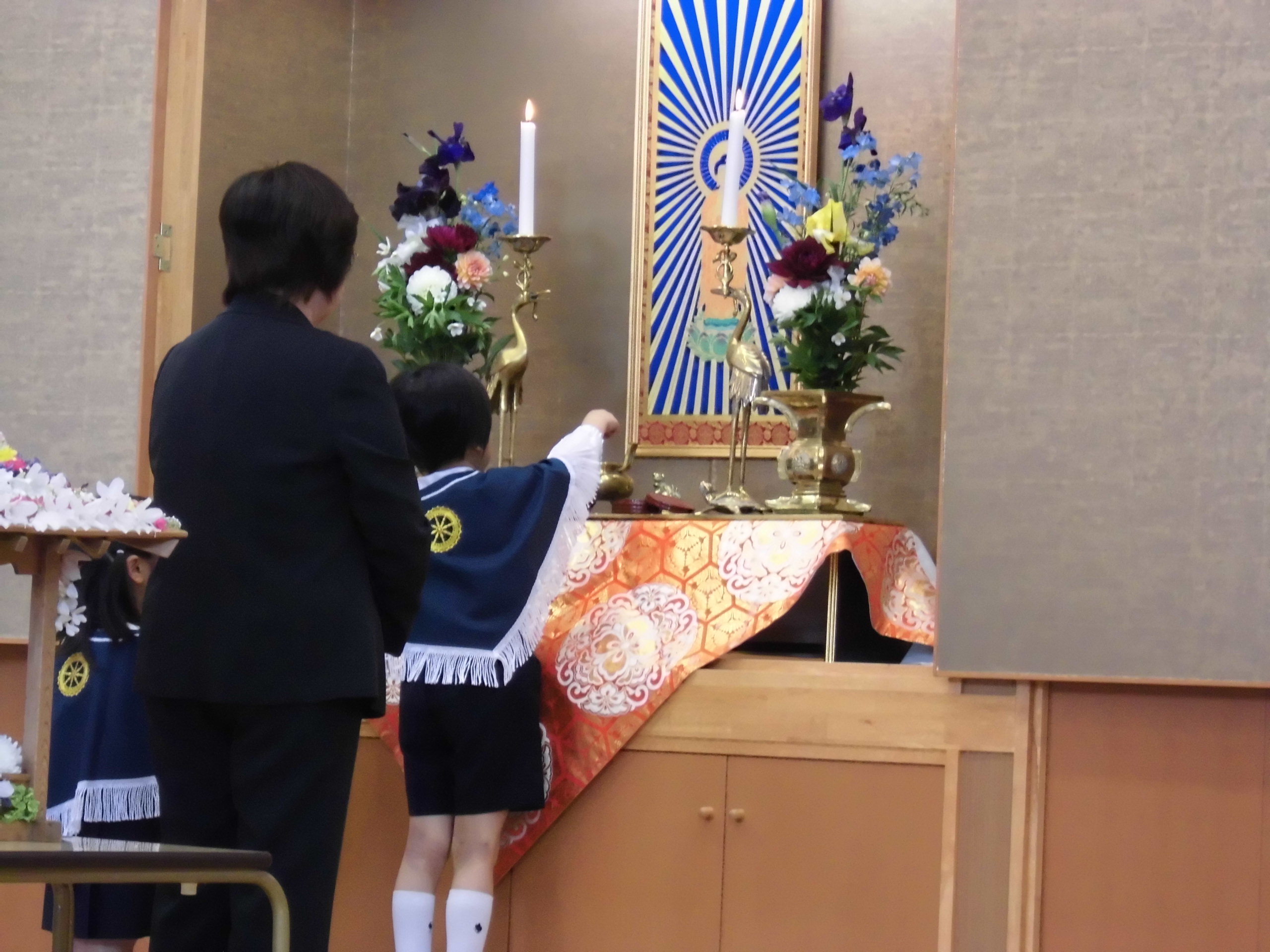 年少以上の子どもたちの花まつりは、年長さんの代表のお友達が献灯・献花・献香をして始まりました。