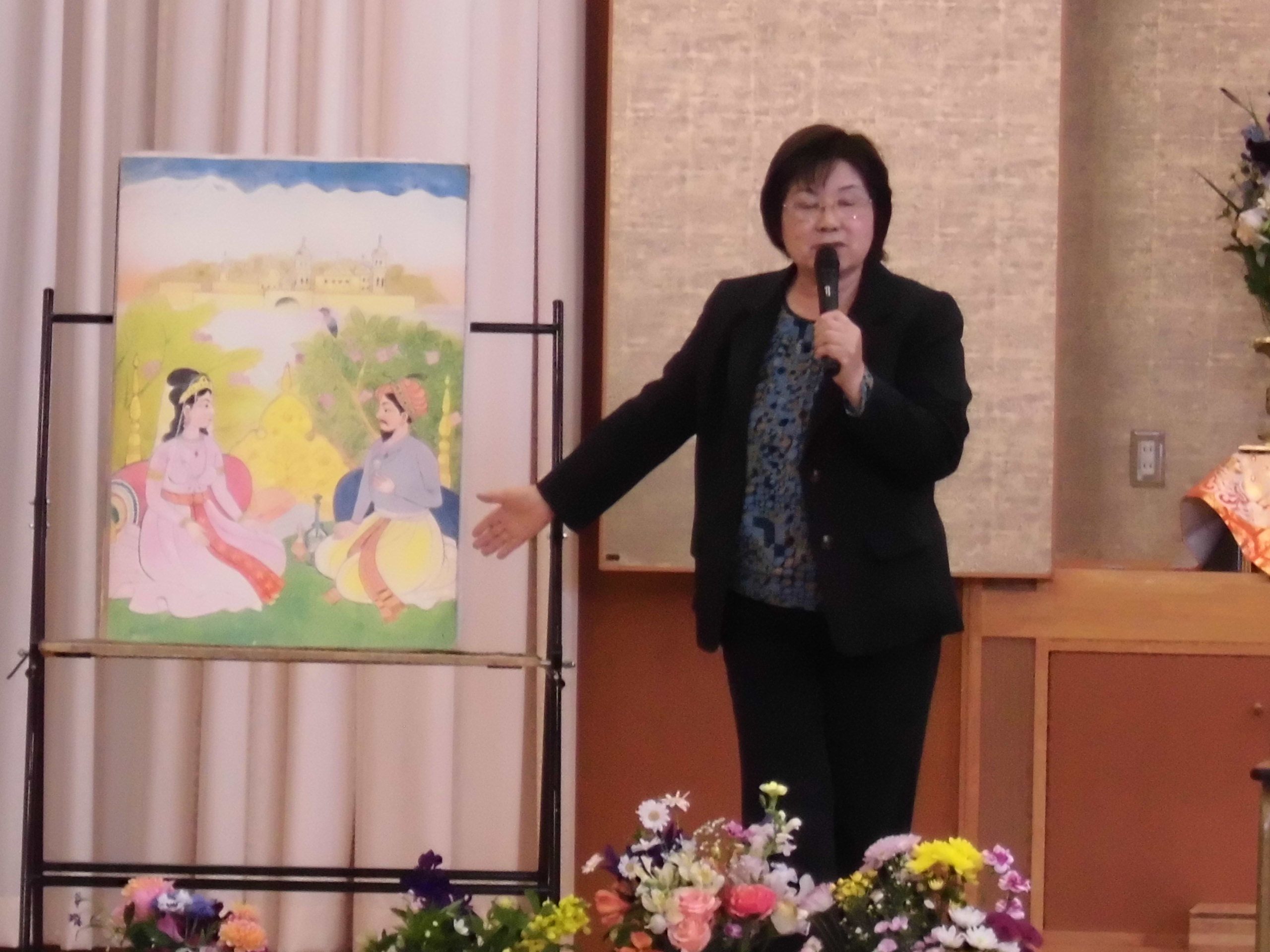 園長先生からお釈迦様のお誕生にまつわる話を、大きな絵を見ながらしていただきました。