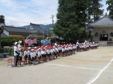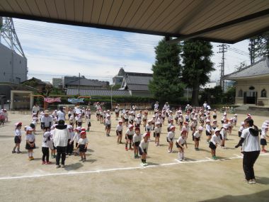 年中さんの体操『ぼよよん行進曲』"おかあさんといっしょ"でおなじみの曲です。小さいお友だちも音楽を聞きながら一緒に身体を動かしていました。