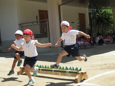 年長さん「野原を駆け抜けて!」足を高く上げて草むらを飛び越えて走ります。力いっぱい最後まで走る姿が見られました。