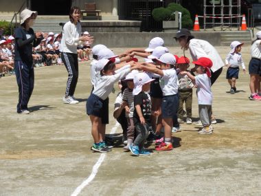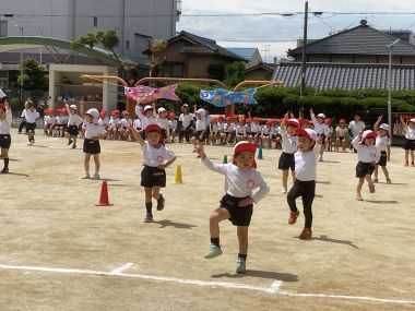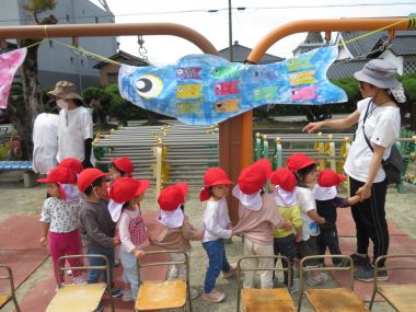 園の生活に慣れ、お友だちや先生と一緒に体を動かす楽しさを味わえるようになってきているこの時期に、園では月遅れで「こいのぼり運動会」をしています。