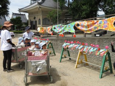園庭の所々に飾られたこいのぼりを小さいお友だちが見て回っています。ブランコ前のこいのぼりは、今年の年長さんが作ったもので、その他の大きなこいのぼりは歴代の年長さんが作ったこいのぼりです。それぞれのクラスで皆で考えて、色んな模様や色で作ってありました。