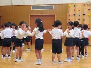 朝のお参りの後、もみじさんはグランドチェーンをしています。半回転してペアのお友だちがかわっていくと…はじめのお友だちに戻りました。