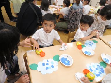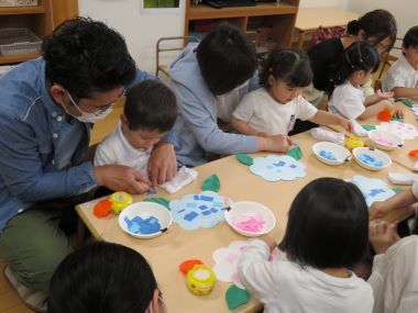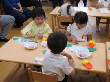 こののりを使う事で、指先を使ったり適量を知ったりすることが出来ます。初めての参観でしたが普段通りの姿を見て頂く事ができました。