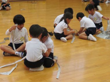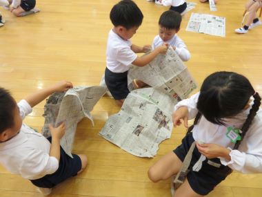 新聞紙をちぎって長くつなげていきます。グループのお友だちと考えたり協力しながらつなげていきます。
