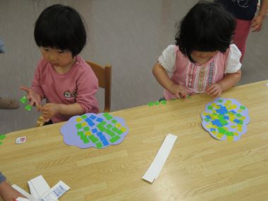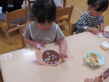 2歳児のお友だちもビニールテープであじさいの花を貼ったり、カタツムリの殻にシールを貼っていました。