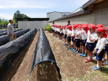 畑ではお世話をして下さる斎藤さんが待っていて下さいました。畑の様子が5月と違います、斎藤さんが遮光のシートをかけて下さってありました。