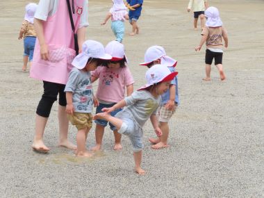 2歳のお友だちも裸足になって出てきました。水たまりを見つけて先生と入ってみます。