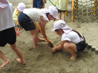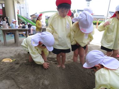 年長さんは慣れたものです。お友だちの足を埋めたり山や道を作ったりしながら遊び始めました。