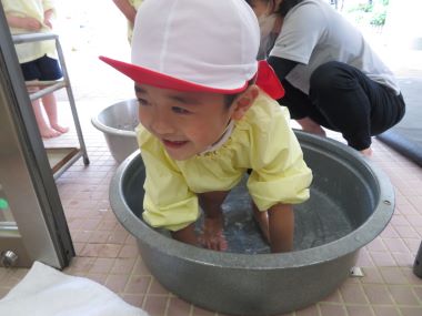 保育室に入る前に足を洗います。自分で足をこすって洗える所をみせてくれました。