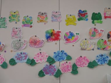 年少さんは、参観日で作ったあじさいとクレヨンでしっかり塗ったカエルやカタツムリが貼ってありました。