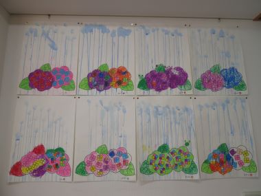 年中さんは、はじき絵のあじさいです。上から絵の具の雨が降っていますね。