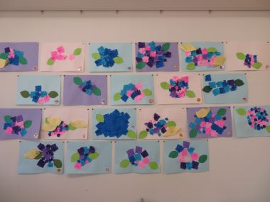 年長さんは一つ一つの花を折り紙で折ったものを貼ったあじさいです。根気よくいくつも折って貼ってありました。