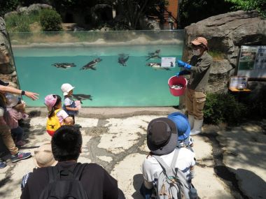 ペンギンは魚の頭から食べるそうですよ。本当かな?皆で見ています。ペンギンがエサを食べようと泳ぐ速さにビックリ!