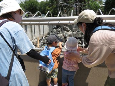 園内を親子でまわります。「一緒に見ようね」お友だちとふみ台に登って下にいるおさるさんを見ています。