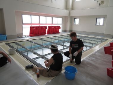 このプールはオフシーズンに床を張って遊んでいたものを、用務員の先生や事務長先生がプールに変身させてくれました。